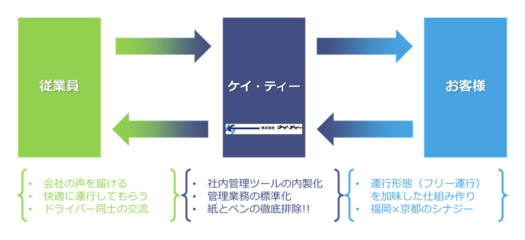 デジタル化が必要な部分とアナログで解決する部分と切り分けを行いながら、ケイ・ティーに関わるステークホルダー全員と”繋がる”ことで、当社に関わる全ての方とのコミュニケーションを活性化して参ります。