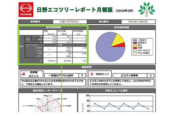日野プロフィアに搭載されているシステムを活用することで、車両の運行状況や燃費データ等を取得しています。